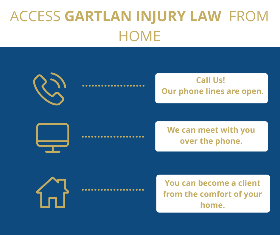 If you were hurt in an accident and are seeking legal help, let the attorneys at Gartlan Injury Law help you – in the comfort of your own home! If you would like to discuss your legal issues with any one of our attorneys, we can simply meet with you by phone.